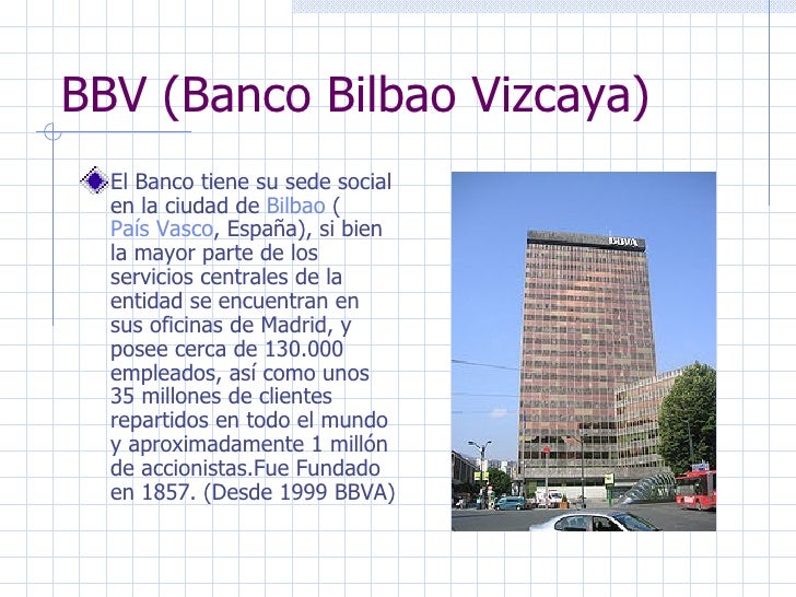 Banco Bilbao Vizcaya Empresas. A. tiene en su cartera productos para particulares como Hipotecas BBVA , Préstamos Personales BBVA, Crédito al Consumo, Tarjetas de Crédito, Banca Electrónica Particulares BBVA xon acceso a su oficina virtual online y Productos para Empresas y. View daily, weekly or monthly format back to when Banco Bilbao Vizcaya Argentaria stock was issued.