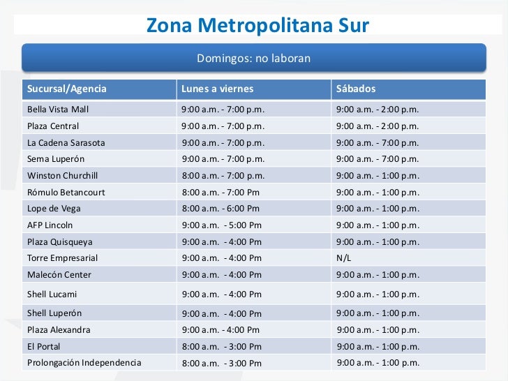 Horarios de sucursales - zona metro sur Santo Domingo