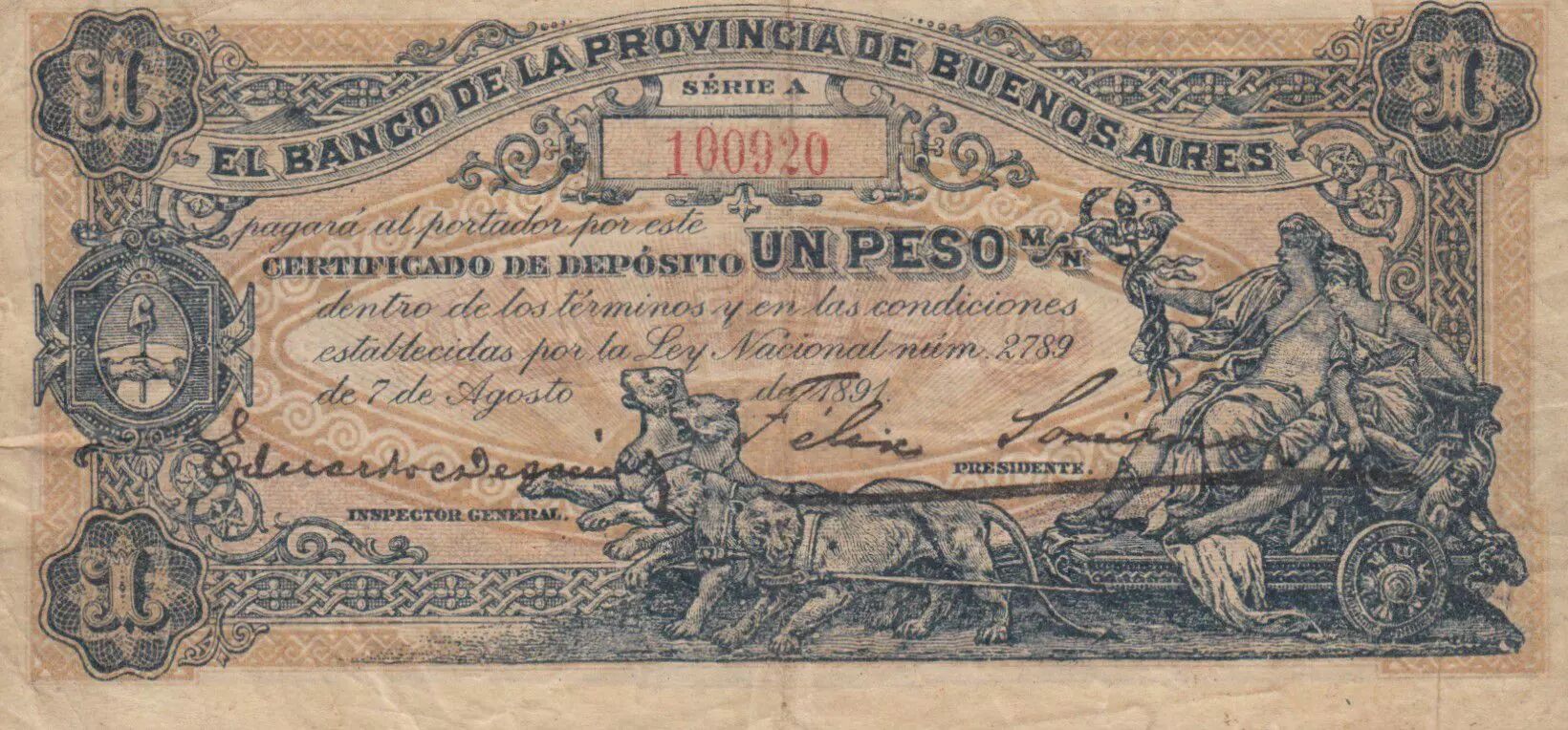 Banknote Argentina 1 Peso Banco de la Provincia de Buenos Aires - 1891 - F to VF - S.573